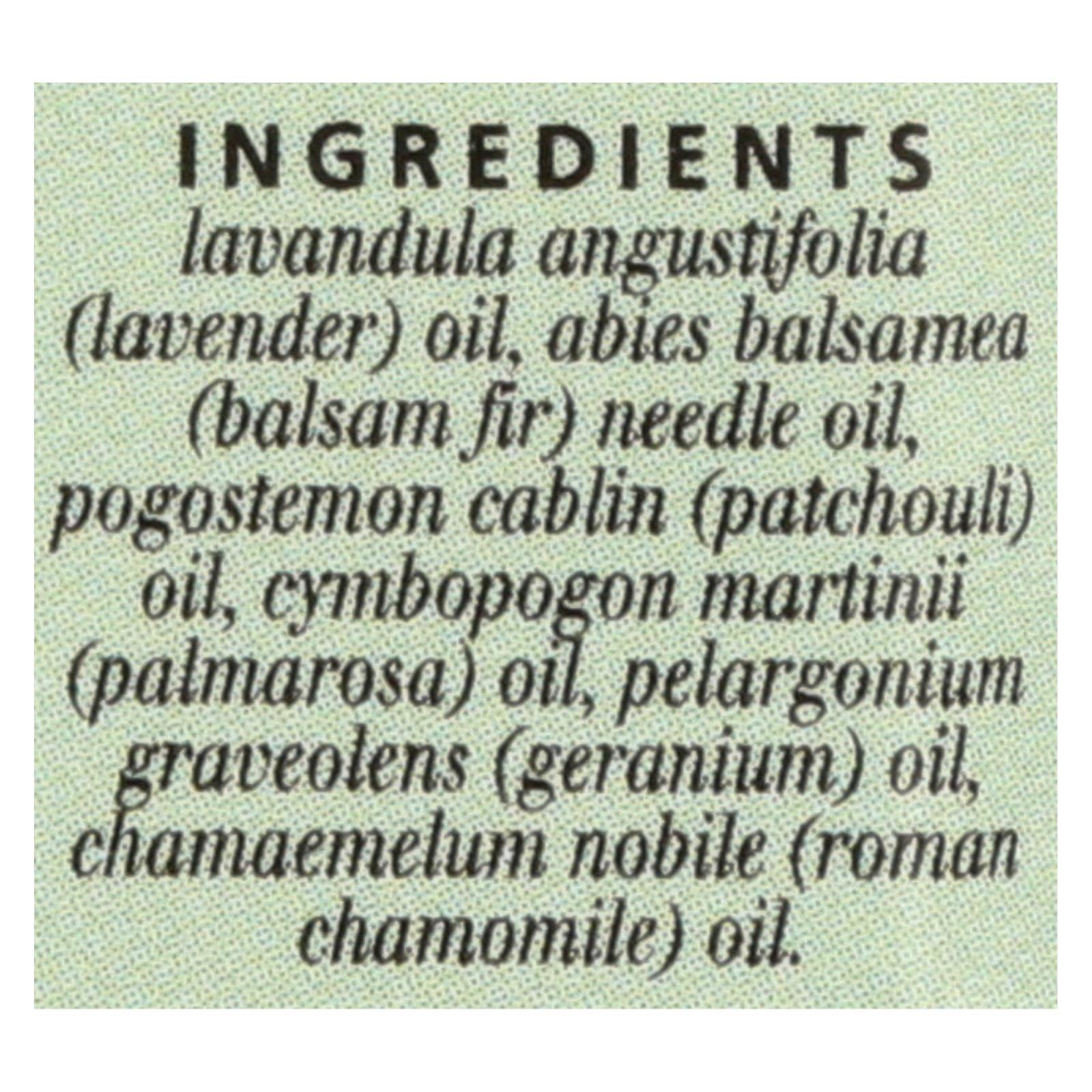 Ingredients: LAVANDULA ANGUSTIFOLIA (LAVENDER) OIL;ABIES BALSAMEA (BALSAM FIR) NEEDLE OIL;POGOSTEMON CABLIN (PATCHOULI) OIL;CYMBOPOGON MARTINII (PALMAROSA) OIL;PELARGONIUM GRAVEOLENS (GERANIUM) OIL;CHAMAEMELUM NOBILE (ROMAN CHAMOMILE) OIL