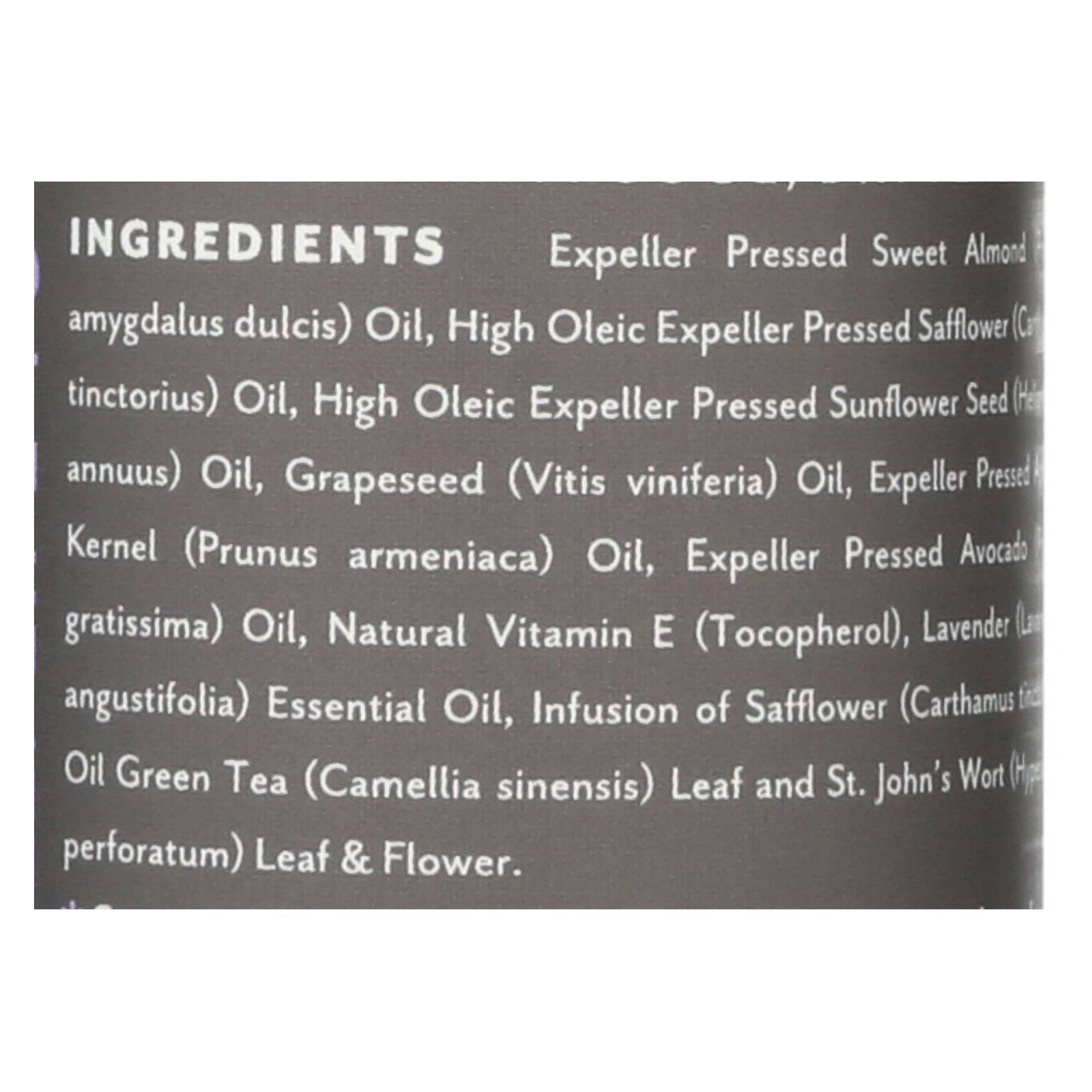 High Oleic Expeller Pressed Safflower (Carthamus tinctorius) Oil, High Oleic Expeller Pressed Sunflower Seed (Helianthus annuus) Oil, Expeller Pressed Sweet Almond (Prunus amygdalus dulcis) Oil, Grapeseed (Vitis vinifera) Oil, Expeller Pressed Apricot Kernel (Prunus armeniaca) Oil, Expeller Pressed Avocado (Persea gratissima) Oil, Lavender (Lavandula angustifolia) Essential Oil, Natural Vitamin E (Tocopherol), Infusion of Safflower Oil, Green Tea (Camellia sinensis) Leaf and St. John's Wort (Hypericum perforatum) Leaf & Flower.