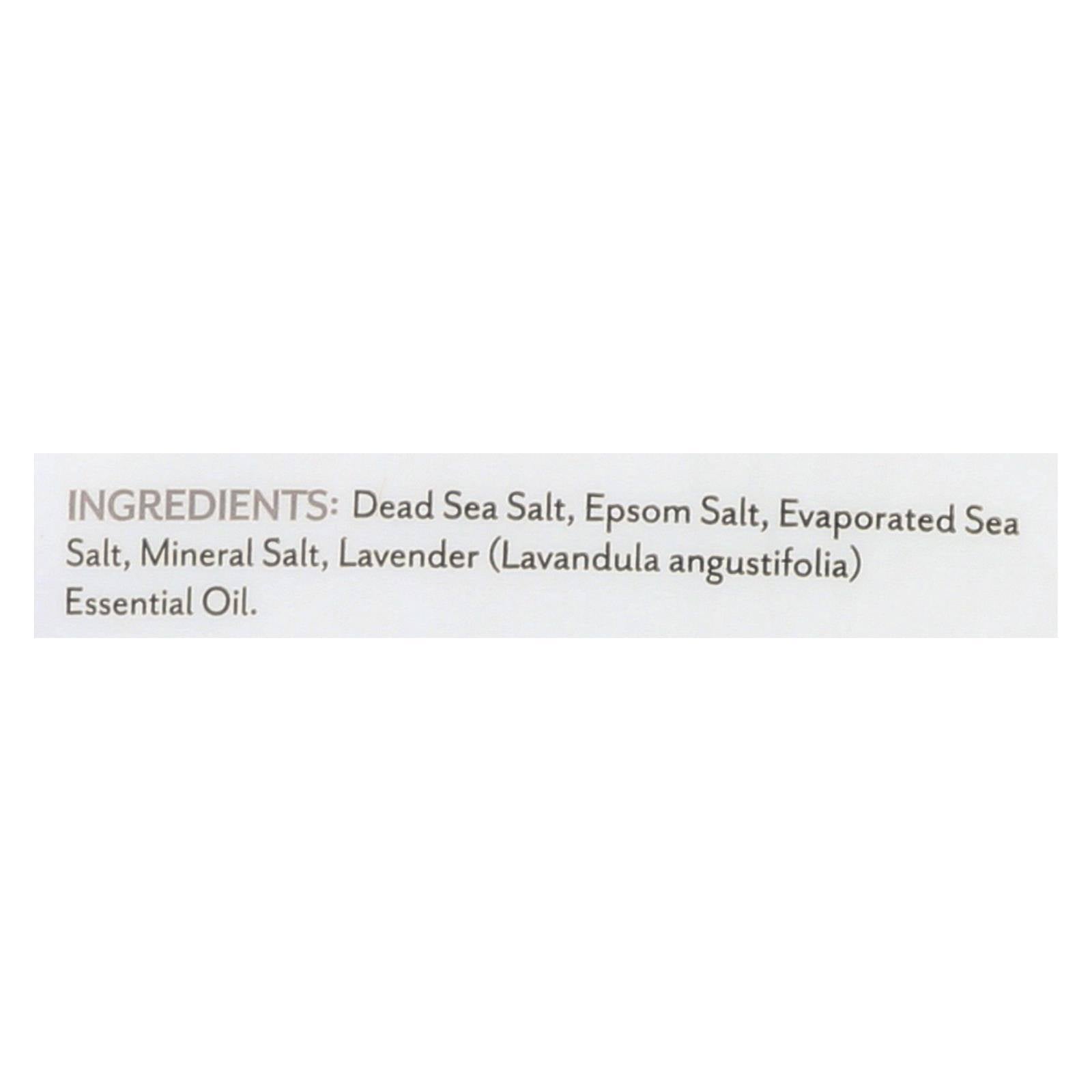 Dead Sea (Maris Sal) Salt, Epsom Salt (Magnesium sulfate USP), Evaporated Sea Salt (Sodium Chloride), Mineral Salt, Lavender (Lavandula angustifolia) Essential Oil.