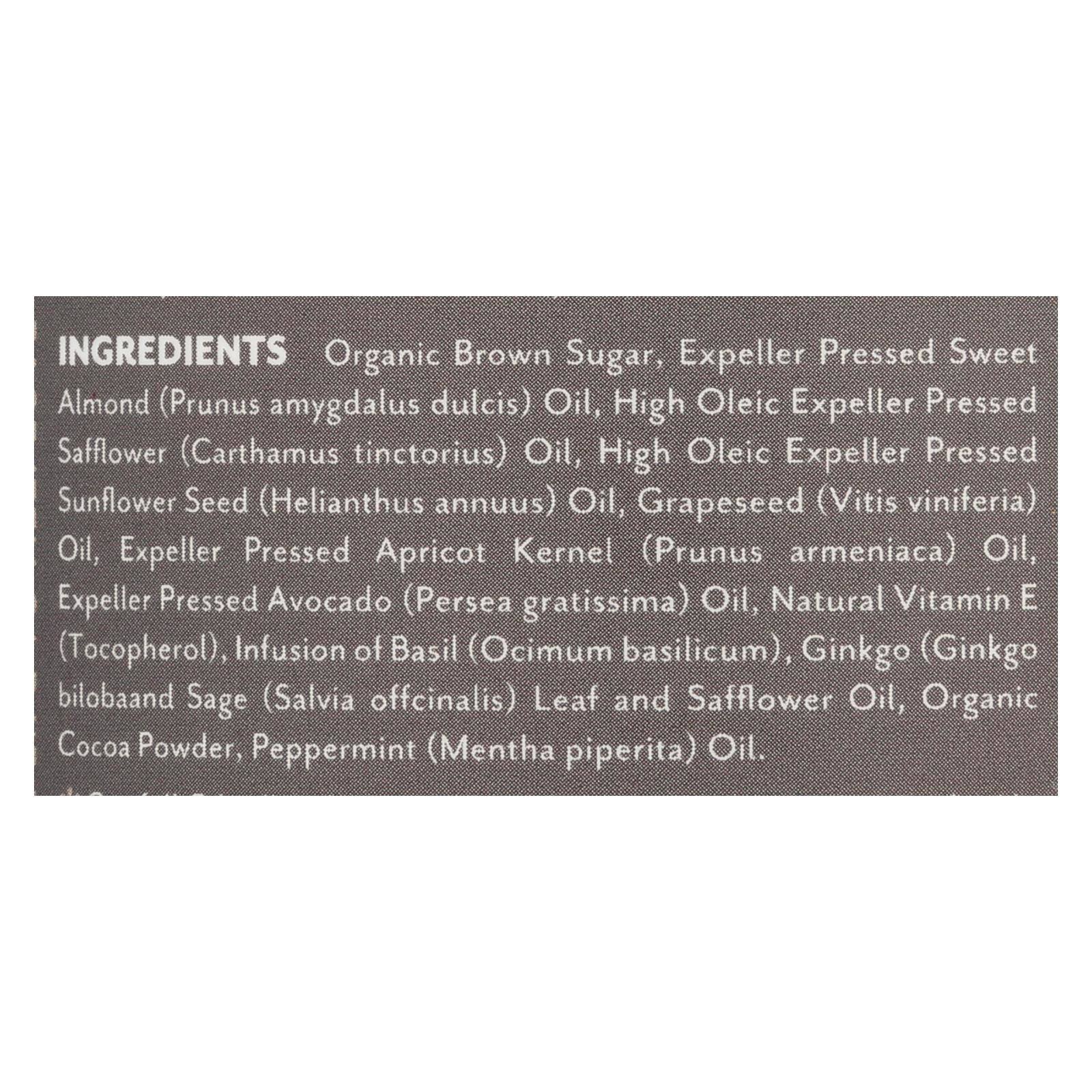 *Brown Sugar, *High Oleic Expeller Pressed Safflower (Carthamus tinctorius) Oil, *High Oleic Expeller Pressed Sunflower Seed (Helianthus annuus) Oil, Natural Chocolate Fragrance, Cocoa (Theobroma cacao) Powder, *Expeller Pressed Sweet Almond (Prunus amygdalus dulcis) Oil, Peppermint (Mentha piperita) Essential Oil, *Grapeseed (Vitis vinifera) Oil, *Expeller Pressed Apricot Kernel (Prunus armeniaca) Oil, *Expeller Pressed Avocado (Persea gratissima) Oil, Natural Vitamin E (Tocopherol), *Sea Buckthorn (Hippophae rhamnoides) Oil, *Argan Nut (Argania spinosa) Oil, Infusion of *Safflower Oil, *Basil (Ocimum basilicum), *Ginkgo (Ginkgo biloba) and *Sage (Salvia officinalis) Leaf. *Certified Organic Ingredient.